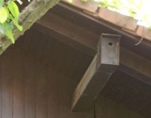 Komentar: na tem mestu stoji gnezdilnica že od leta 1997 in nudi sinicam varne gnezdilne pogoje. Splošno mnenje je, da je vrtno gnezdilnico najbolje postaviti na drevesno deblo sadnega drevja, vendar to ni res. Pod napušč postavljene gnezdilnice so varne pred plenilci in vremenskimi neprilikami! Trajnost tako nameščenih gnezdilnic je več deset let, ker les ni izpostavljen vlagi in gnitju. Vse kar je potrebno storiti je, da po končani gnezditvi odstranimo staro gnezdo. Dobro očiščena gnezdilnica čaka na naslednjo gnezdilno sezono.