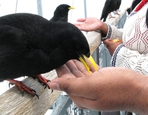 Ob gorskih kočah v Alpah planinske kavke različno hrano jedo z roke, foto: Neha Viswanathan