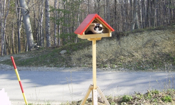 Na koncu pa naj še povem, kako na enostaven način zagreniti mačkom veselje do krmilnic. Postavimo dve krmilnici od 5 do 10 metrov narazen tako, da se krmilnici med seboj vidita. Maček si bo izbral eno krmilnico in tam prežal na ptice v neposredni bližini ali pa kar v krmilnici, kot na spodnji sliki. |
