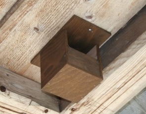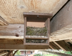 Način namestitve: gnezdilna niša je skozi podaljšano streho na sprednji in zadnji strani privijačena pod lesen napušč 3 metre visoko.