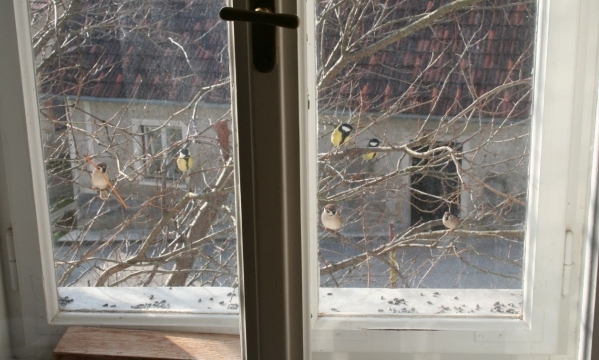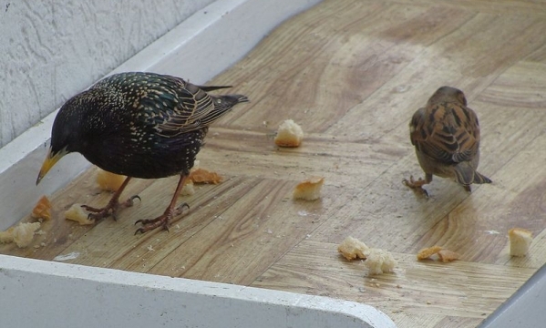Velike sinice in poljski vrabci so redni obiskovalci okenskih polic Škorec in samec domačega vrabca se hranita kruhom na okenski polici, foto: Wikipedia
