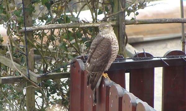 Samica skobca čepi na ograji poleg krmilnice, kadar lov na male ptice pri krmilnicah ni bil uspešen, se mnogokrat zgodi, da skobec za nekaj trenutkov posedi ne mestu, kjer so se še malo prej zadrževale ptice. Z nekaj sreče lahko takrat skobca fotografiramo, foto: Milan Ogrin