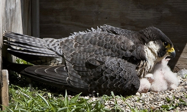 Samica sokola selca na nekaj dni starih mladičih, foto: Wikipedia |