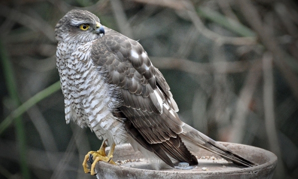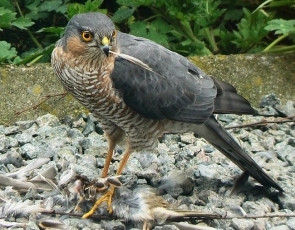 ![]() Približno 14 dni stari mladiči, pri tej starosti mladičev, tudi samica prične z lovom ![]() V letu je dobro viden dolg prečno progast rep ![]() Samica skobca čaka na svoj plen kar na krmilnem koritu. Lov tokrat ne bo uspešen, ker ga ptice dobro vidijo in se krmilnici ne bodo približale. |