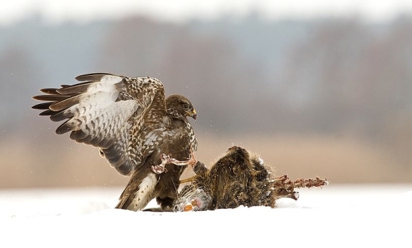 Kanja na kadavru na cesti zbite živali. Na odprtem polju se ponujajo odlični pogoji za fotografiranje ptic,